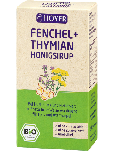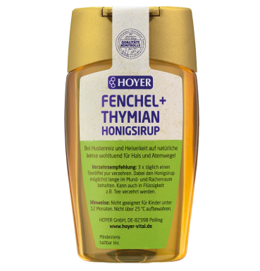 Der Hoyer Fenchel‑Thymian Honigsirup vereint die natürliche Süße von Blütenhonig mit der wohltuenden Kraft von Fenchel und Thymian. Die beiden klassischen Kräuter werden seit Generationen geschätzt, um den Hals zu beruhigen, die Stimme zu pflegen und Hustenreiz auf natürliche Weise zu mildern. Ein idealer Begleiter für die ganze Familie – besonders in der kalten Jahreszeit. Fenchel überzeugt mit seinem milden, angenehmen Aroma und ist für seine wohltuende Wirkung bekannt – auch bei Kindern sehr beliebt. Thymian gilt als traditionelles Hausmittel für Hals und Stimme. Sein ätherisches Öl kann beruhigend wirken – besonders bei nächtlichem Hustenreiz. Gemeinsam entsteht ein Honigsirup, der wohltut, lecker schmeckt und sich vielseitig einsetzen lässt. Beispielweise im Tee, im Gebäck oder zur Prävention von Erkältungssymptomen. Dosierspender mit 250 g