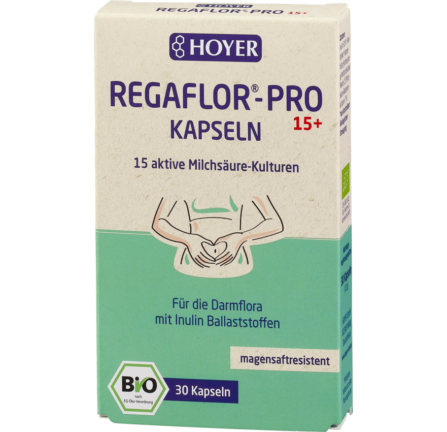 Die Hoyer Regaflor-Pro 15+ Kapseln bieten eine hochwertige Kombination aus 15 sorgfältig ausgewählten Milchsäurebakterien-Stämmen und Inulin – ideal zur Unterstützung der Darmflora und damit eines wichtigen Zentrums unseres Wohlbefindens. Der Darm ist mit dem gesamten Organismus vernetzt und spielt eine bedeutende Rolle für Verdauung, Immunsystem und sogar des seelischen Gleichgewichts. Jede Kapsel enthält 3 Milliarden aktive Milchsäurebakterien, darunter Bifidobakterien, Lactobacillen, Lactococcus und Streptococcus-Stämme. besonders empfehlenswert während oder nach einer Antibiotika-Einnahme. Dank der magensaftresistenten Kapsel gelangen die Kulturen gezielt dorthin, wo sie wirken sollen: in den Darm. Die Rezeptur enthält zusätzlich Inulin aus kontrolliert ökologischem Anbau, das den Milchsäurebakterien als wertvolle Nahrungsgrundlage dient. Die Einnahme ist flexibel gestaltbar: