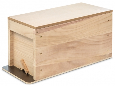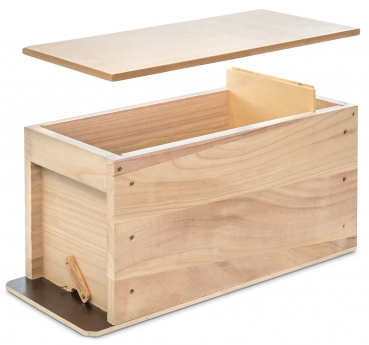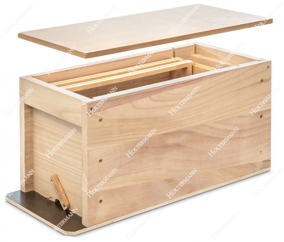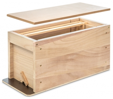 for 5 frames standard size or Zander, with closable entrance hole, hardboard lid and front and rear handles. With standard size, space remains as a feeding chamber. Completely made of solid wood