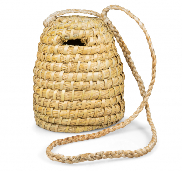 handgeflochtener Stroh-Dekokorb mit offenem Boden und einer langen Kordel zum Aufhängen. Hängedistanz ca. 48 cm, einem Durchmesser ca. 14,5 cm, Höhe ca. 17,5 cm. Wandstärke 1 cm, Gewicht ca. 0,2 kg In Fundgrube, da mit leichten Fehlern