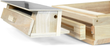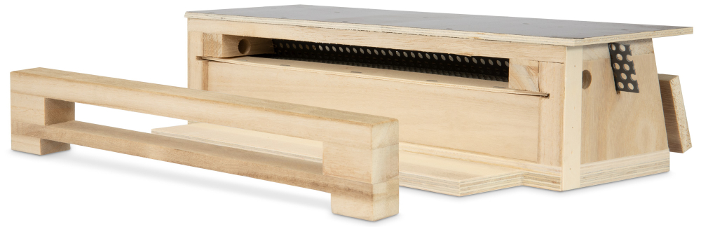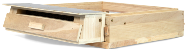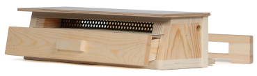 made of wood as a flight hole attachment with laterally extractable round hole comb with adapter and pollen bowl, for DN Wooden Hives High Bottom, Art. No. 2402