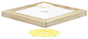 made of wood with rebate, consisting of wooden frame with bung plate and large Bee Escapes. The Bee Escapes are supplied loose and attached underneath the bunghole with tacks, for example