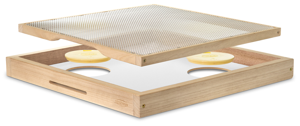 Consisting of wooden frame with Entrance, removable false bottom panel with two bung holes, crown boards and round Bee escapes, mesh board with ventilation grille. Can therefore be used in 6 ways: Bee escape board, Multi purpose crown board with proboscis contact, closed Multi purpose crown board, top vent, top flight hole and feed grid