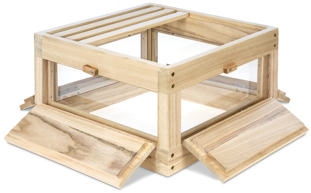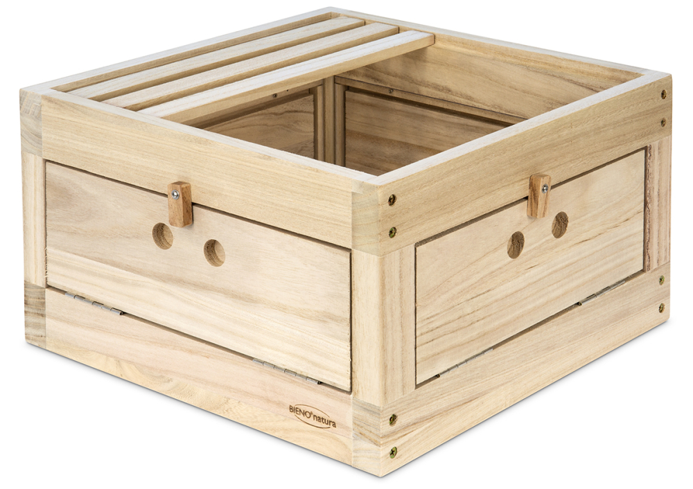 Suitable for 8 comb bars. The highlight is the four hinged side panels, each with an acrylic pane behind it for an unobstructed view of the bee colony