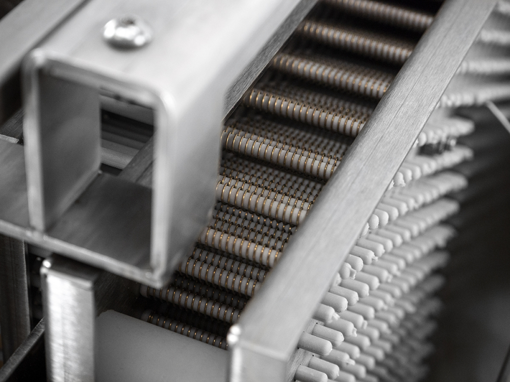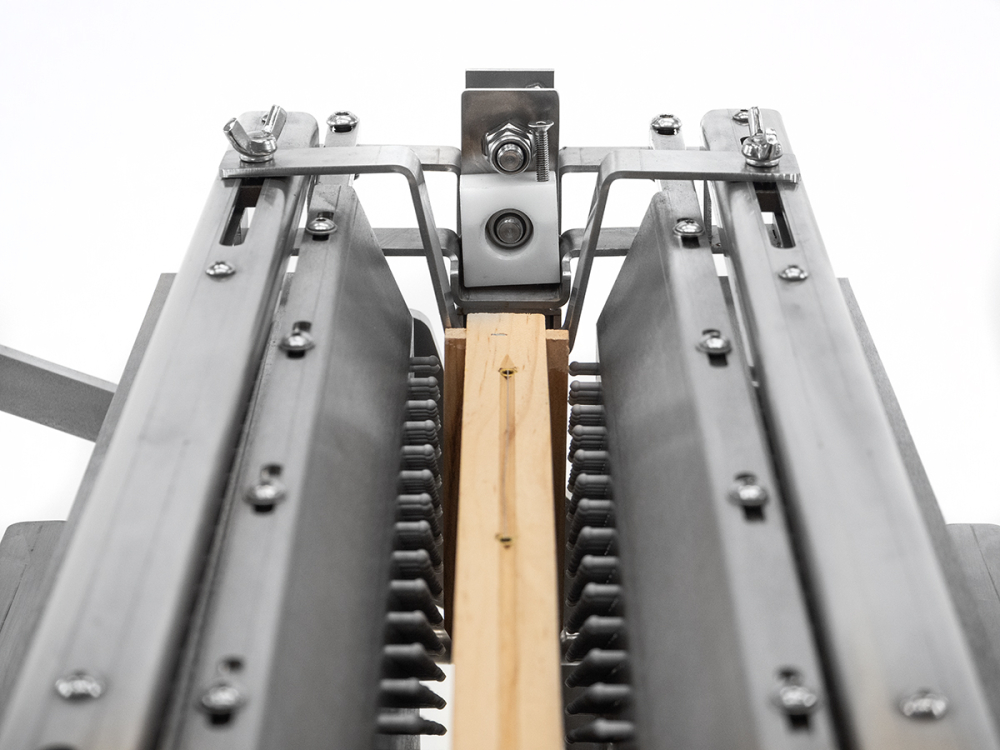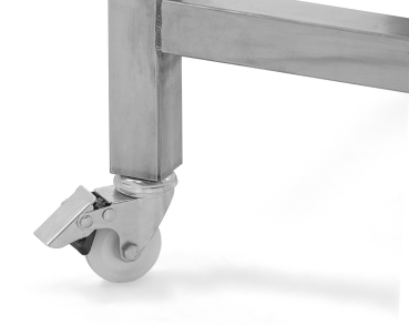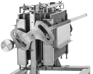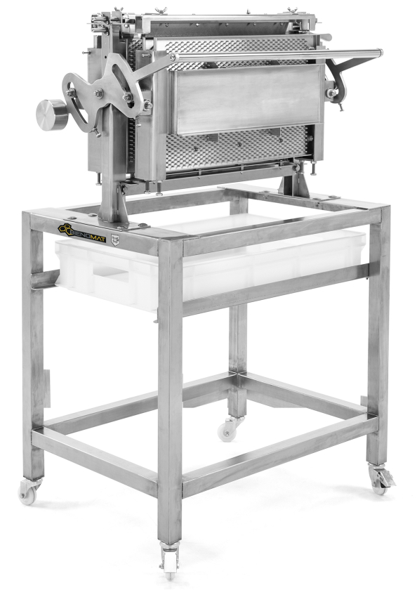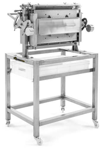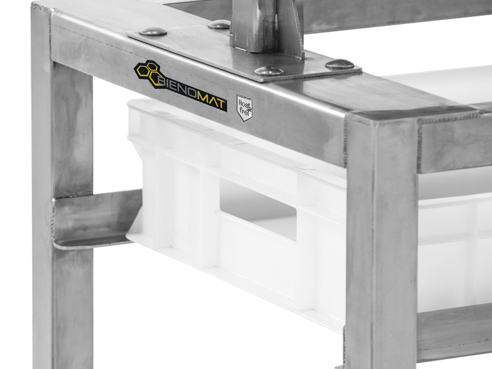 Completely made of stainless steel with plastic spring pins, swivel castors with stop and removable plastic drip tray. For loosening even highly viscous honeys, e.g. heather honey. The arrangement of numerous, fine spring pins on a die ensures even pressure on the removed combs. For frames up to a length of 482 mm and a height of 290 mm. The spring pins are carefully pressed into the honey-filled combs without damaging the center wall. This process is repeated up to three times, whereby the position of the spring pins shifts horizontally by a few millimeters each time they are pressed. As a result, the entire area of the combs on the frames is finely worked over the entire surface.