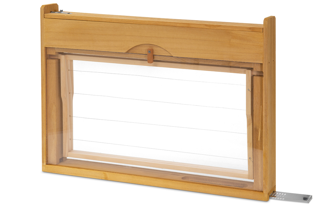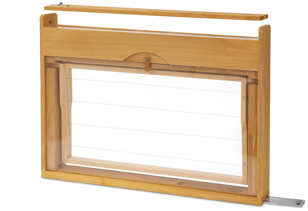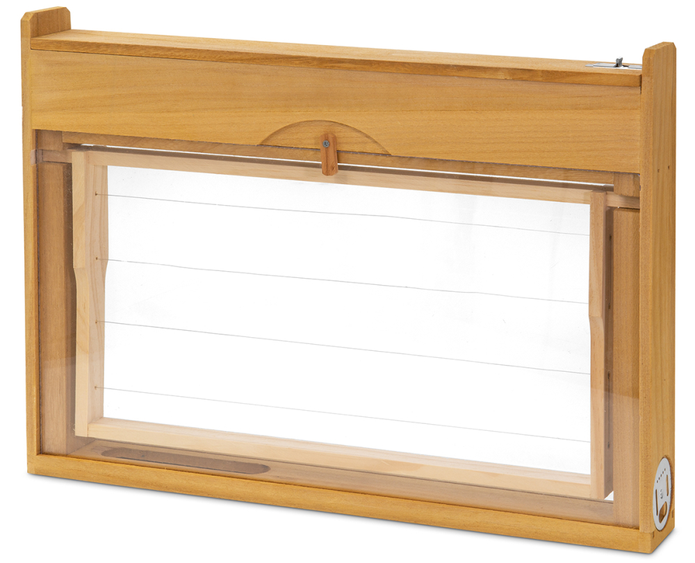 mit Futterkammer, einem Rähmchen Zandermaß 477 x 220 mm, seitlichen Lüftungsschlitzen, Fluglochrosette und Scheiben Außenmaß ca. 50 x 6 cm, Höhe 36 cm, Gewicht ca. 2 kg In Fundgrube, da andere Machart