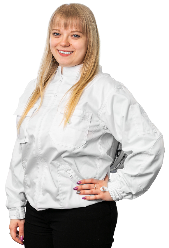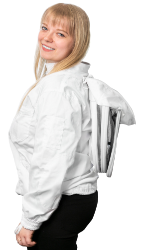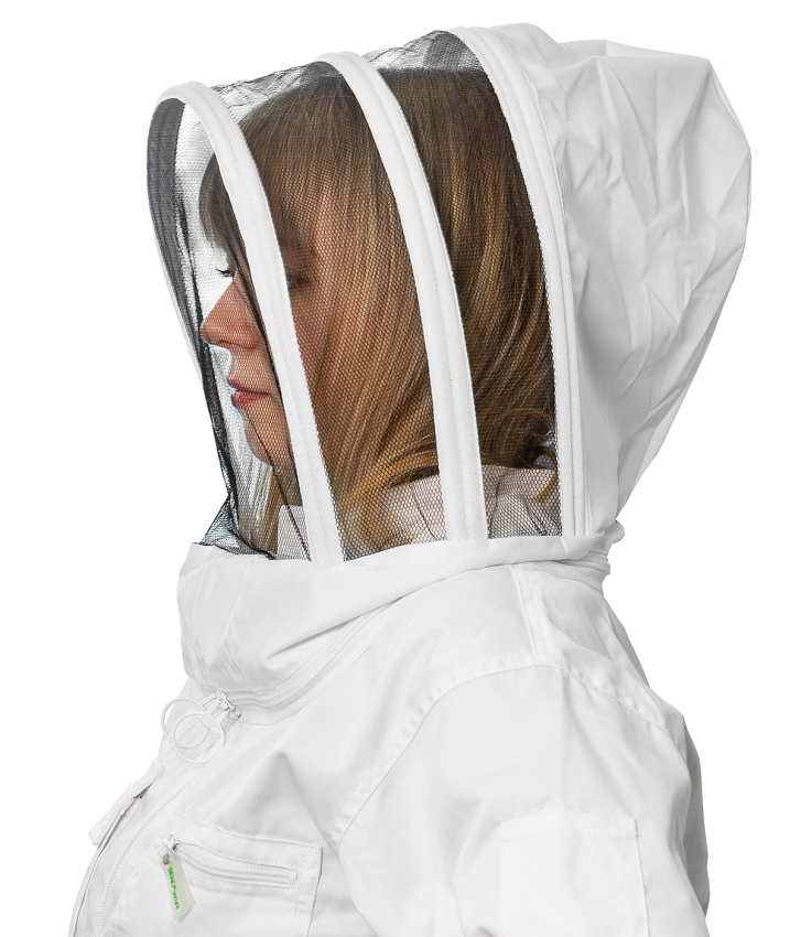 Lightweight fabric made of 65% polyester and 35% cotton, white and fully washable. Various pockets with zippers, adjustable elastic cuffs on the sleeves and a self-standing English beekeeper's hood with black ProFlox visor fabric. Thanks to the front zipper, the shirt can also be used as a jacket