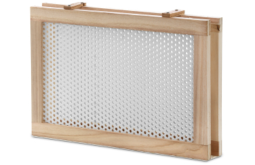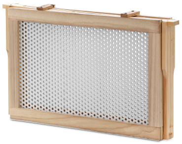aus Holz, mit Rundloch-Gittern aus Kunststoff, passend für ein Rähmchen Normalmaß oder Zander bis 25 mm Oberträgerbreite und Dadant US oder Dadant Blatt bis 28 mm Oberträgerbreite, Außenmaß je nach Rähmchenmaß, Breite 45-50 mm
