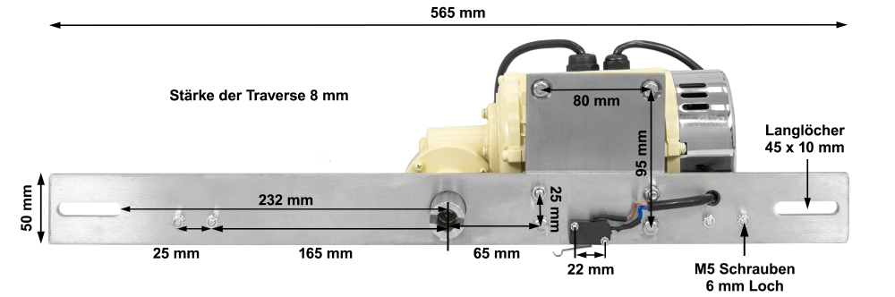 Robust repulsion motor 230 V / 110 W mounted on 8 mm thick stainless steel crossbar of 56.5 x 5 cm with lateral slotted holes