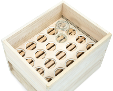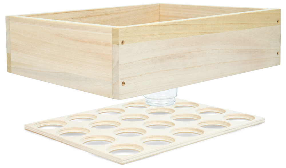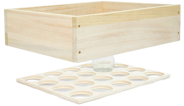 2-part set for comb honey extraction; the perforated plate is placed on the frames of a frame and fitted with empty jars. The frame is then placed on top. Over time, the bees will fill these jars with comb honey. The set is suitable for 20 jars Neutral, TO or Deep with a lid opening of 78 to 82 mm - ideal for 500 g to 1,000 g jars. Suitable for the Liebig 10er Zander and Liebig 12er DN hive