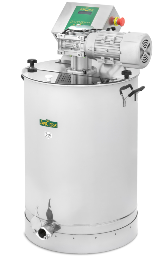The ApiCera® stirring machine 140 kg fully automatic is the ideal solution for beekeepers who want to stir large quantities of honey gently, evenly and fully automatically. With its fully automatic, digital control, the appliance ensures a constant speed and precise stirring cycles - for optimum results with every batch of honey. The powerful 230 V / 370 W drive system enables approx. 30 revolutions per minute and guarantees an even consistency of the honey - without any manual intervention. The mixing bowl is made entirely of high-quality stainless steel, is hygienic, durable and easy to clean. With a capacity of 140 kg of honey and a vessel size of Ø 46 cm (inside) and 68.5 cm high, the ApiCera® honey stirrer offers sufficient space for medium and large batches of honey. The bottom-level pinch tap enables almost complete emptying without honey loss. The rubberized cold handles also ensure safe handling - even during operation.